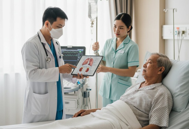 Bác sĩ thăm khám và theo dõi bệnh nhân cao tuổi nghi ngờ nhiễm nấm nội tạng.