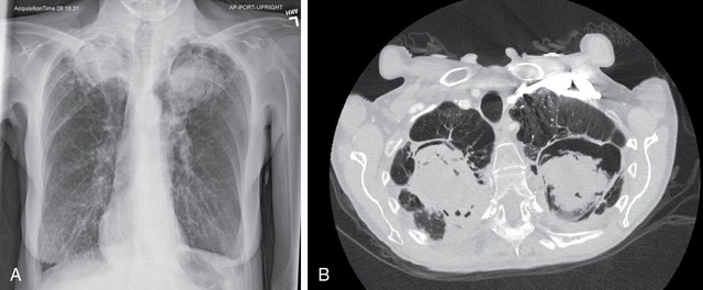 Hình ảnh CT ngực cho thấy tổn thương phổi điển hình do nấm Aspergillus ở người già.