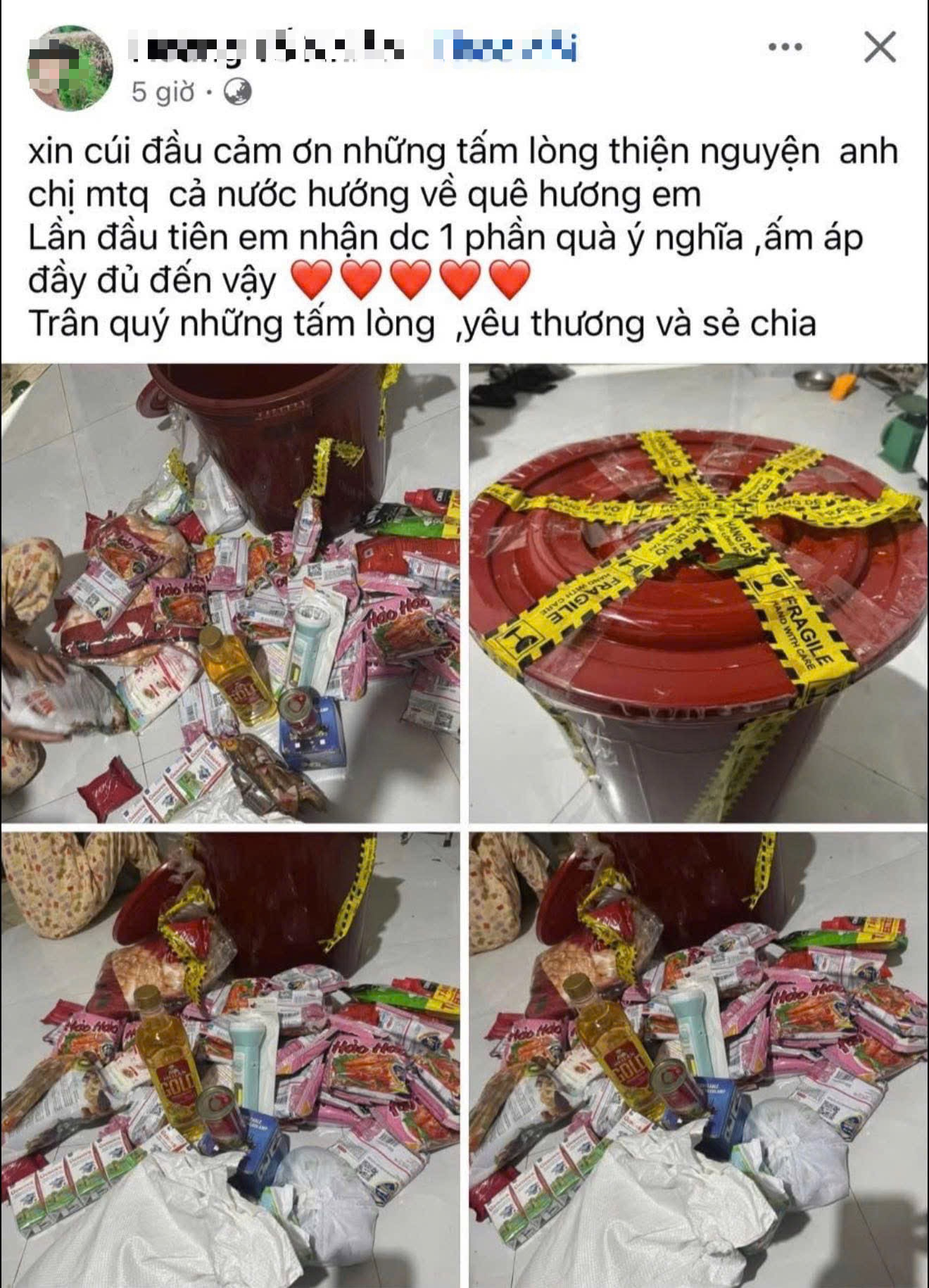 "Xin cám ơn những tấm lòng thiện nguyện cả nước hướng về quê hương em. Lần đầu tiên em nhận được một phần quà ý nghĩa, ấm áp và đầy đủ đến vậy" - một tài khoản Facebook Hoàng Tố Nhiên viết, đăng kèm hình ảnh là phần quà xô nhựa, bên trong chứa hàng cứu trợ nhu yếu phẩm.