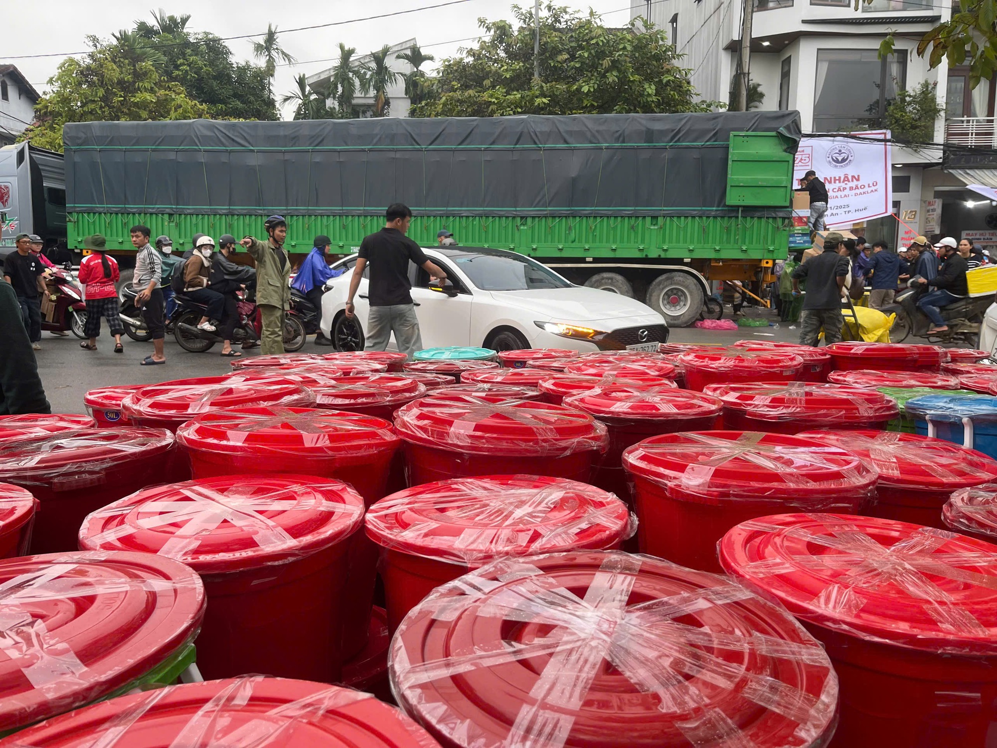 Hàng trăm thùng nhựa đựng hàng cứu trợ được nhóm thiện nguyện SOS75- Đội xe 0 đồng Huế chuẩn bị sẵn sàng trước khi lên đường vào với bà con vùng lũ Đắk Lắk.