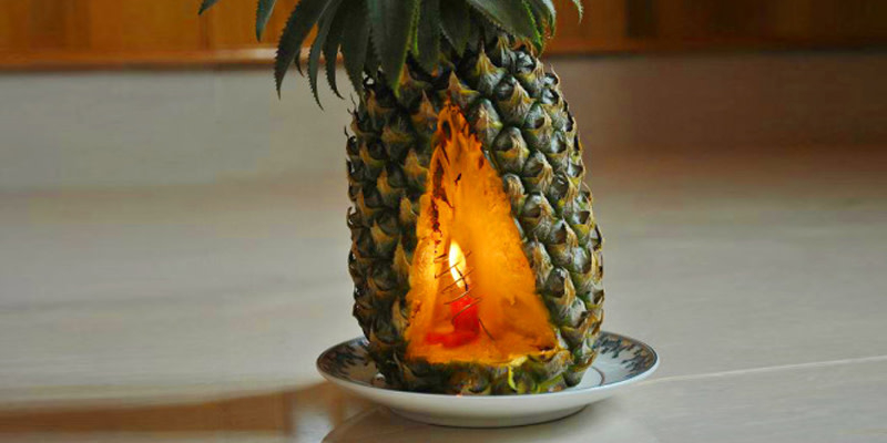 Cách khử mùi bằng trái dứa phổ biến nhất là làm đèn nến trái dứa, vừa giúp thanh lọc không gian, vừa tạo hương thơm tự nhiên dễ chịu. Để thực hiện, bạn chỉ cần chuẩn bị một trái thơm còn nguyên vỏ và cuống, một cây nến nhỏ, dao gọt và một chiếc đĩa nhỏ.