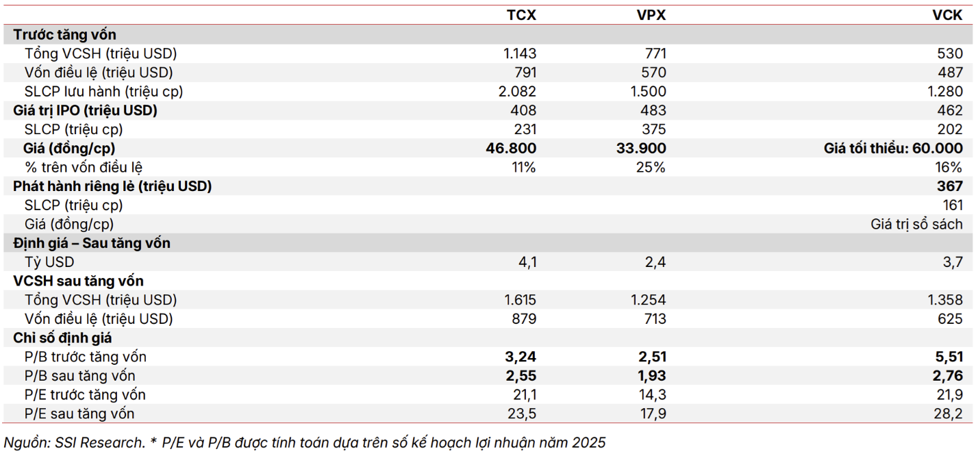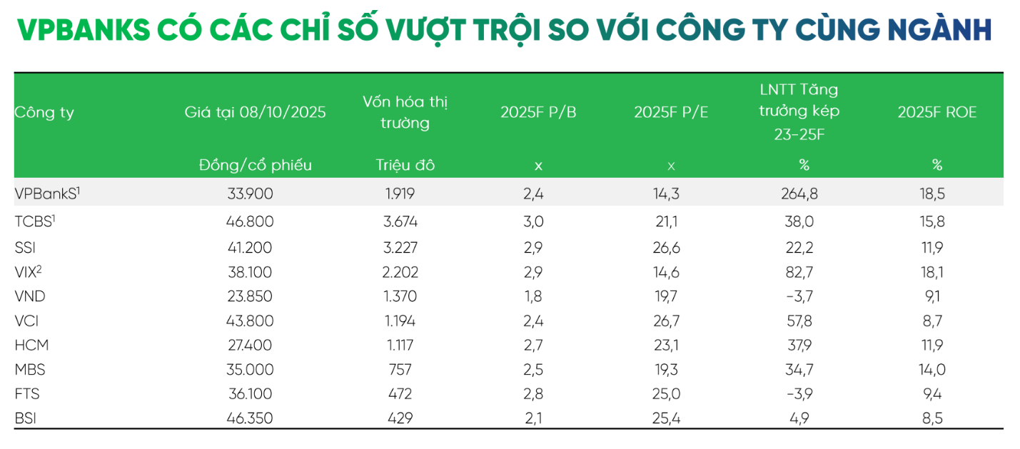 Vietcap chỉ ra rằng định giá của VPBankS (P/B dự phóng trước phát hành năm 2025 là 2,4 lần, P/E 14,3 lần) thấp hơn nhiều so với trung vị P/B dự phóng của các doanh nghiệp cùng ngành (P/B dự phóng 2025 2,5 lần, P/E 22,3 lần). So sánh của Chứng khoán SSI cho thấy chỉ số P/B sau tăng vốn của VPBankS chỉ ở mức 1,93 lần, thấp hơn đáng kể so với các công ty chứng khoán triển khai IPO trong năm 2025.