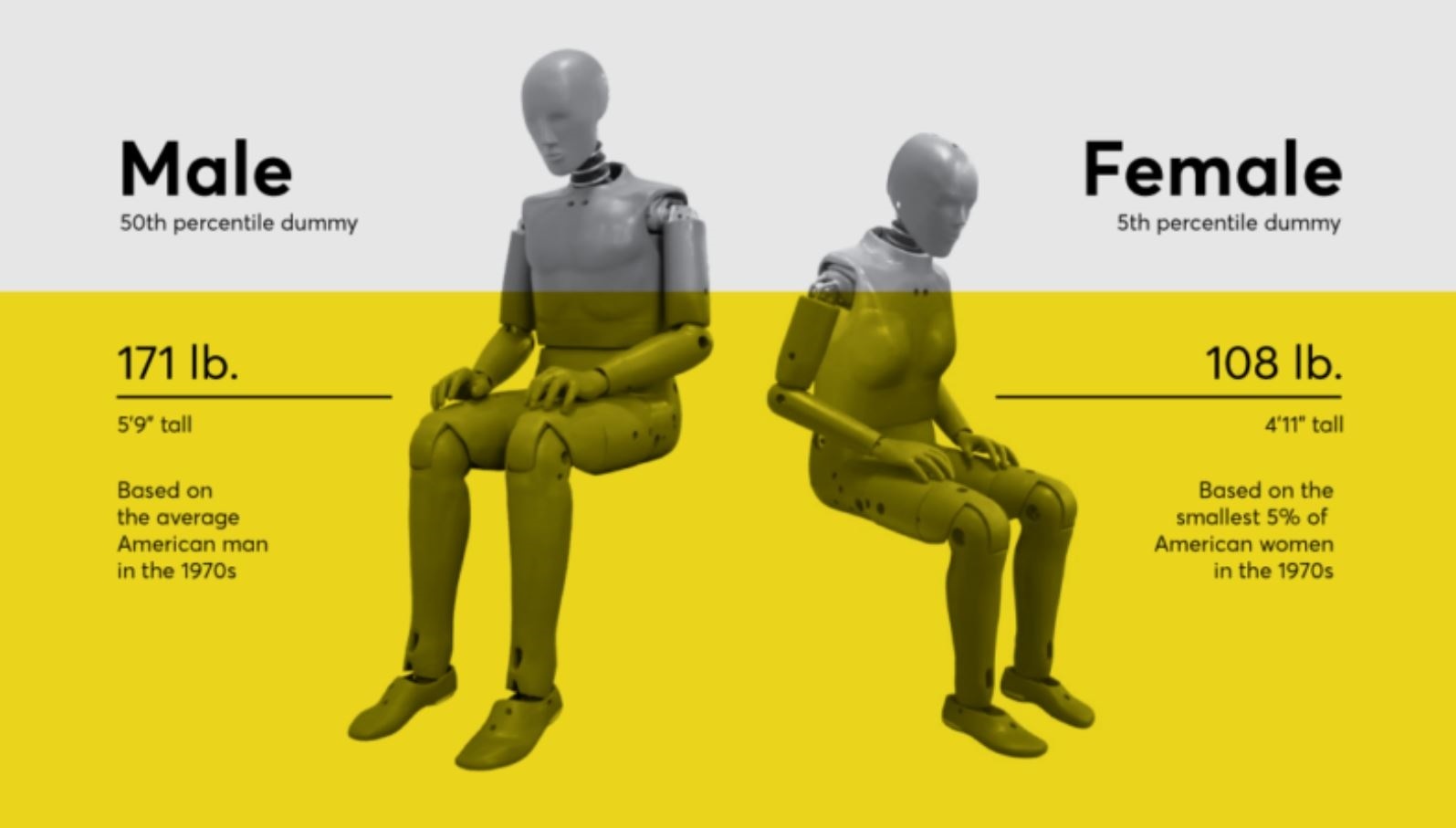 Tại Mỹ, nhiều năm qua, ngành công nghiệp ô tô chủ yếu dựa vào hình nộm thử nghiệm va chạm mô phỏng cơ thể nam giới trung bình, cao khoảng 1,75 m và nặng 77 kg. Điều này dẫn tới việc phụ nữ - dù chiếm hơn một nửa số người lái xe - gần như không được đại diện đầy đủ trong các nghiên cứu an toàn.