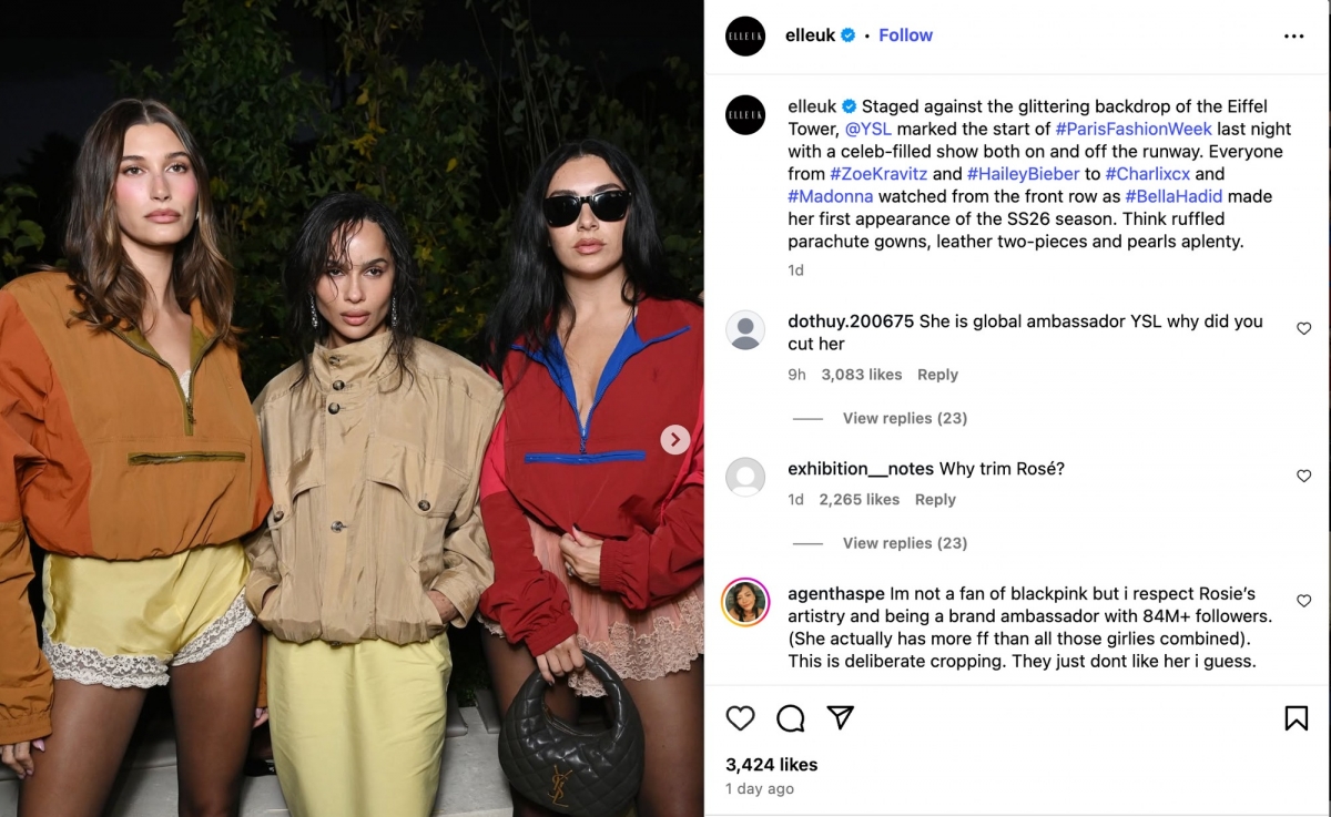 Tại show Saint Laurent, Rosé ngồi hàng ghế đầu cùng Hailey Bieber, Zoë Kravitz và Charli XCX. Với tư cách đại sứ toàn cầu, sự hiện diện của cô vốn được coi là tâm điểm. Tuy nhiên, cách Elle UK xử lý hình ảnh đã biến buổi xuất hiện của Rosé thành nguồn cơn của một trong những cuộc tranh luận dữ dội nhất Tuần lễ Thời trang Paris năm nay.