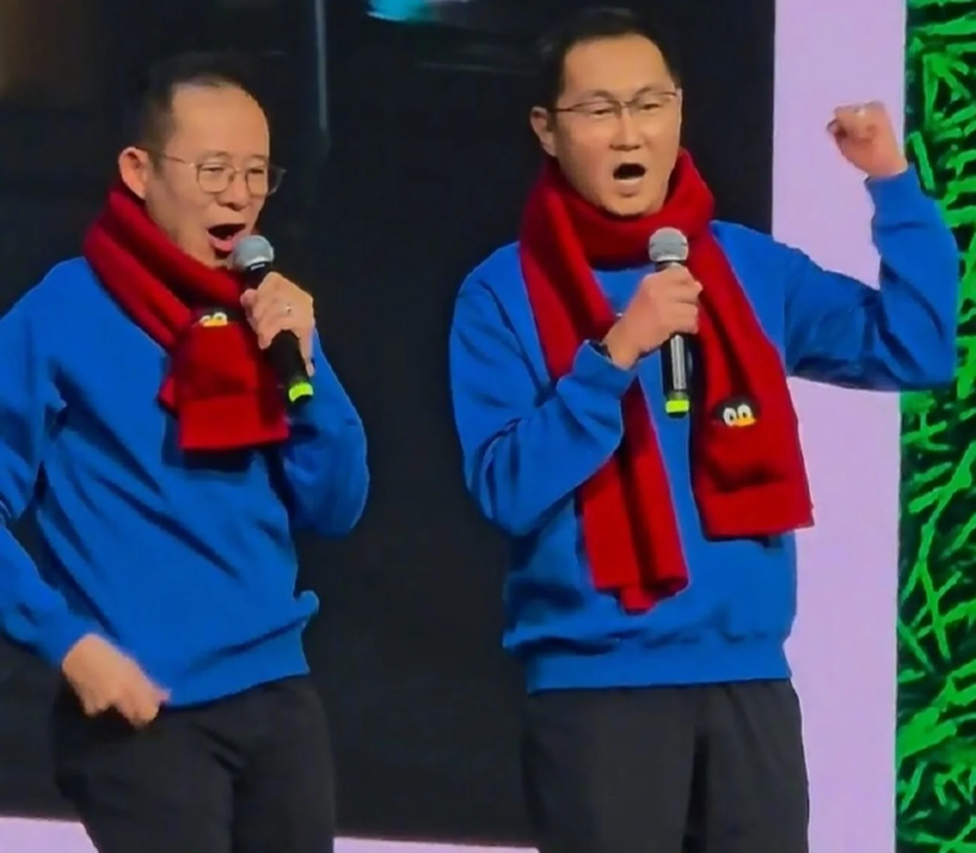 Chủ tịch Martin Lau (trái) và Giám đốc điều hành Pony Ma Huateng hát chúc mừng nhân viên Tencent tại Trung tâm Thể thao Vịnh Thâm Quyến vào ngày 26.1 - Ảnh: Weibo