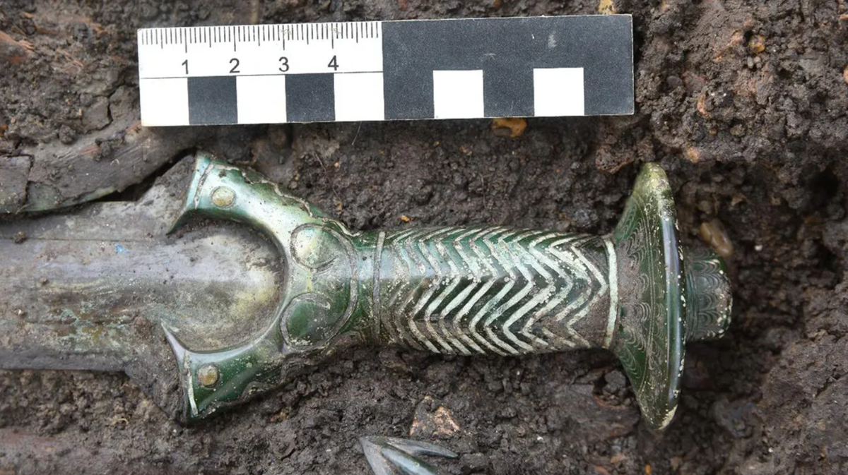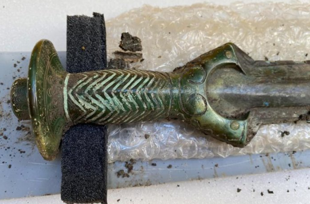 Không chỉ dừng tại đó, điểm đặc biệt ở thanh kiếm đồng này đó là phần chuôi kiếm có thiết kế dạng bát giác độc lạ. Ảnh: @Văn Phòng Bảo Vệ Di Tích Bang Bavaria.