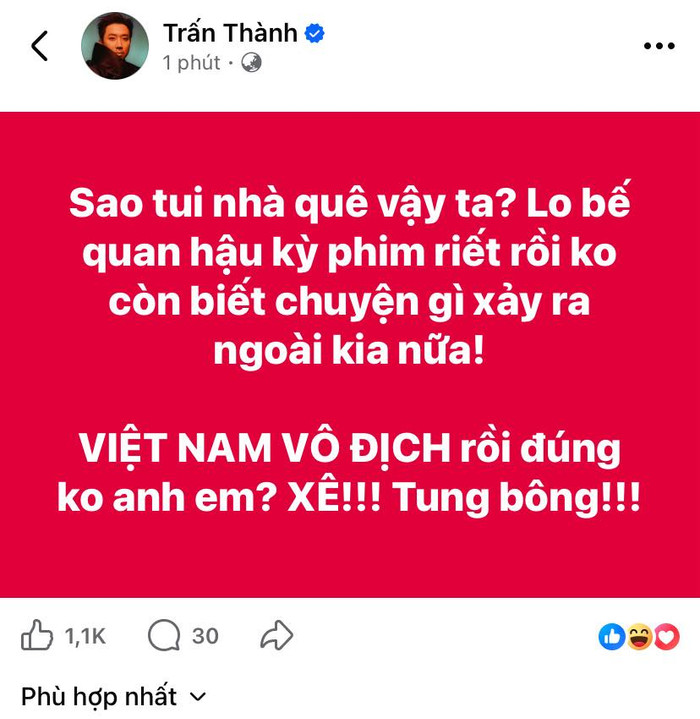 Trấn Thành mới đây tiếp tục trở thành tâm điểm chú ý trên mạng xã hội khi bất ngờ đăng tải dòng trạng thái ăn mừng chiến thắng của tuyển U22 Việt Nam tại SEA Games 33. Tuy nhiên, điều khiến khán giả bật cười lại nằm ở việc nam MC ăn mừng muộn hơn mọi người gần một ngày. Cụ thể Trấn Thành hài hước chia sẻ lý do vì bận làm hậu kỳ phim, không biết chuyện gì xảy ra ở bên ngoài: “Sao tôi nhà quê vậy ta? Việt Nam vô địch rồi đúng không anh em? Xê! Tung bông!”.