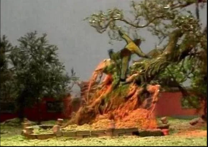 Trong đêm, Đại Thánh quay lại vườn, dùng sức mạnh quật đổ cả cây tiên. (Ảnh: Sohu)