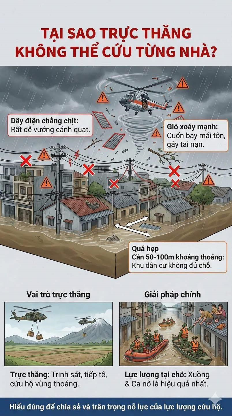 Nhiều người dân và mạng xã hội đặt câu hỏi: Tại sao các trực thăng cứu hộ không bay đến từng nóc nhà để đưa người mắc kẹt ra ngoài? Câu hỏi này xuất phát từ tình thương và sự lo lắng, bởi ai chứng kiến cảnh người dân bị nước lũ cô lập cũng đều xót xa. Tuy nhiên, thực tế kỹ thuật cho thấy trực thăng không phải phương tiện phù hợp để cứu từng người tại các khu dân cư.