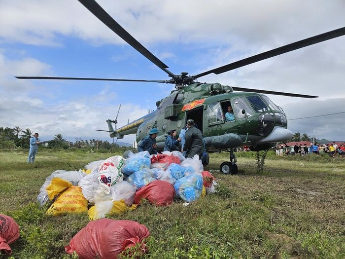 Trực thăng chở vật tư cứu trợ đồng bào vùng lũ lụt đã hạ cánh an toàn.