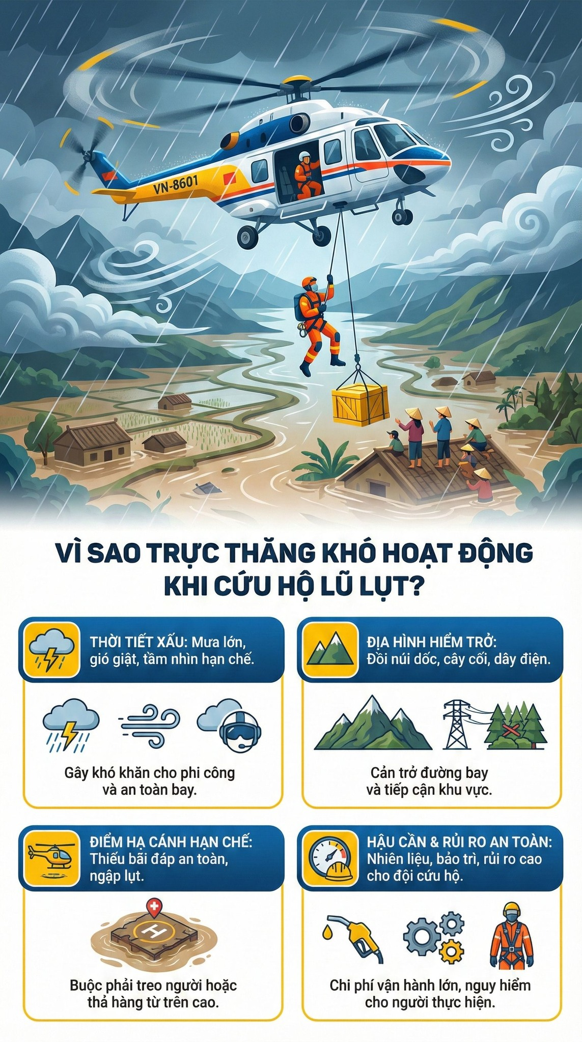 Do đó, trực thăng chủ yếu đảm nhận vai trò trinh sát, tiếp tế, vận chuyển y tế và cứu hộ ở vùng núi hoặc các khu vực bị chia cắt, còn việc cứu từng mái nhà vẫn dựa vào xuồng, thuyền và lực lượng tại chỗ. Trong lũ lụt, sức tạt từ cánh quạt máy bay khi hạ thấp xuống mặt nước có thể khiến người đuối sức bị cuốn trôi, cộng hưởng với sóng nước sẽ rất nguy hiểm.