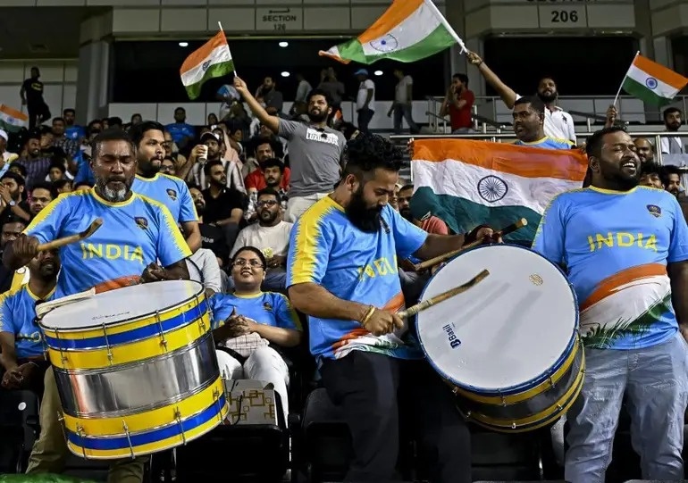 Cổ động viên Ấn Độ cổ vũ trong trận đấu với Qatar. Ảnh: NurPhoto.