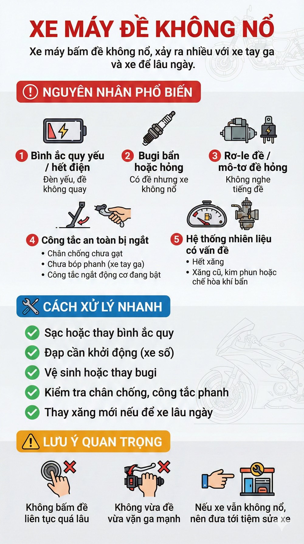 Xe đề không nổ có thể xuất phát từ nguyên nhân rất nhỏ, nhưng nếu xử lý sai cách có thể dẫn đến hư hỏng lớn, đặc biệt là hệ thống điện và động cơ. Việc hiểu rõ nguyên nhân trên cả ô tô và xe máy giúp người sử dụng chủ động hơn, tiết kiệm chi phí và tránh rủi ro khi lưu thông.