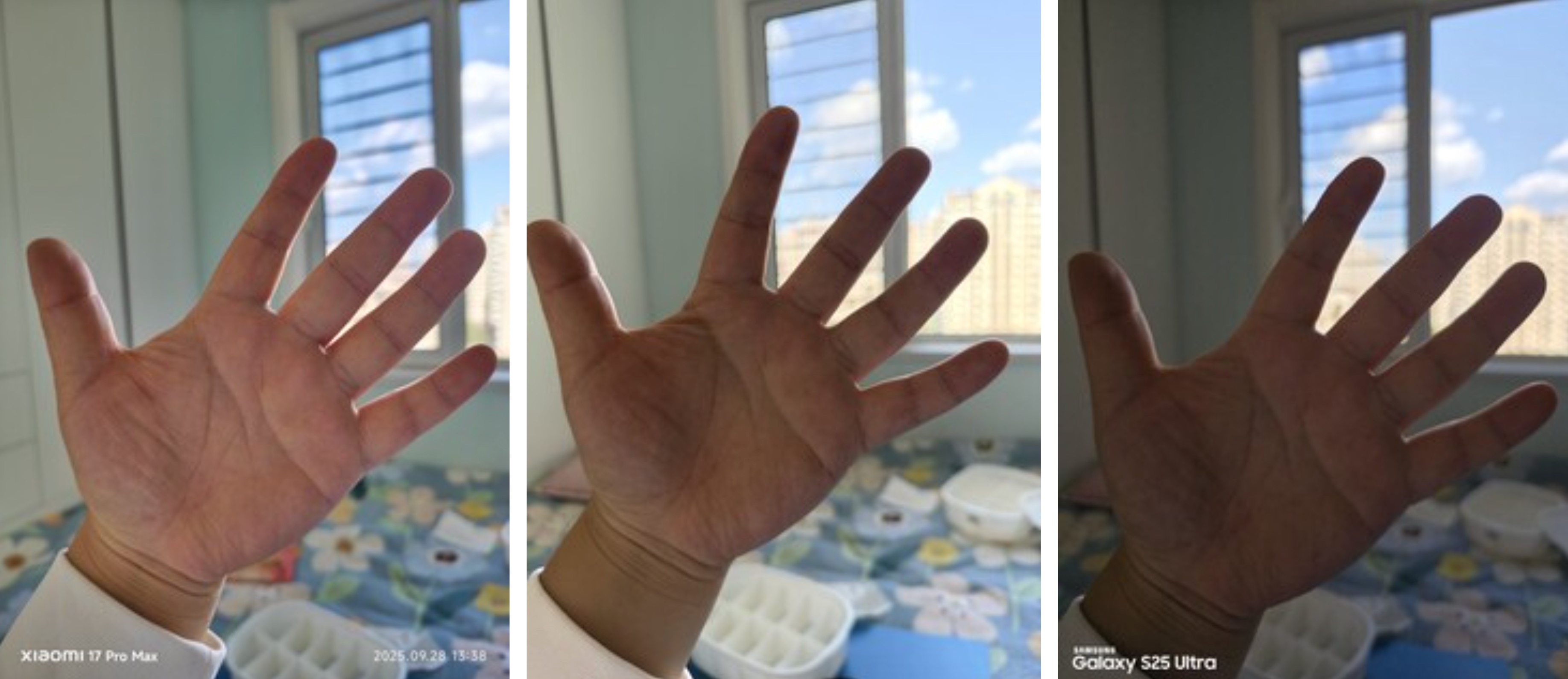So sánh ảnh HDR của Xiaomi 17 Pro Max, iPhone 17 Pro Max và Samsung Galaxy S25 Ultra. Ảnh: Ice Universe.