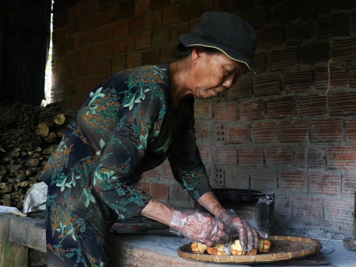 Bà Nguyễn Thị Khươu (75 tuổi) giữ lửa đều để tạo nên những chiếc bánh thuẫn vàng ươm, bung nở như những đóa mai ngày Tết