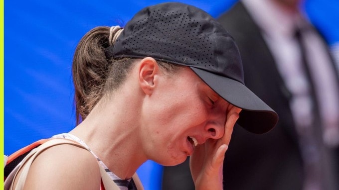 Swiatek khóc sau khi phải bỏ cuộc giữa trận gặp Ann Li, trên sân Arantxa Sanchez, tổ hợp quần vợt Caja Majica, Madrid, Tây Ban Nha hôm 26/4. Ảnh: Reuters