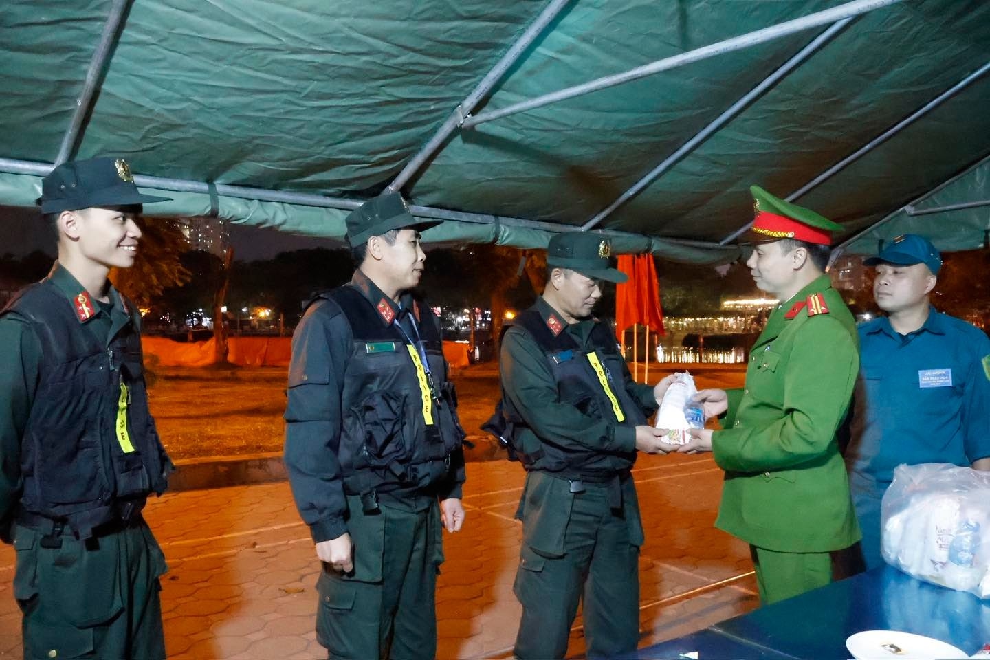 Là địa bàn có trận địa pháo hoa tại khu vực hồ Văn Quán, Đoàn Thanh niên và Hội Phụ nữ Công an phường Hà Đông đã chủ động chuẩn bị 500 suất ăn gồm bánh mỳ và nước uống, kịp thời tiếp sức cho các lực lượng làm nhiệm vụ bảo vệ. Trung tá Phạm Văn Trọng, Trưởng Công an phường Hà Đông cho biết, Ban Chỉ huy Công an phường trực tiếp thăm hỏi, động viên, thể hiện sự quan tâm sâu sát đối với cán bộ, chiến sĩ và các lực lượng phối hợp đang túc trực xuyên đêm vì bình yên của Nhân dân.