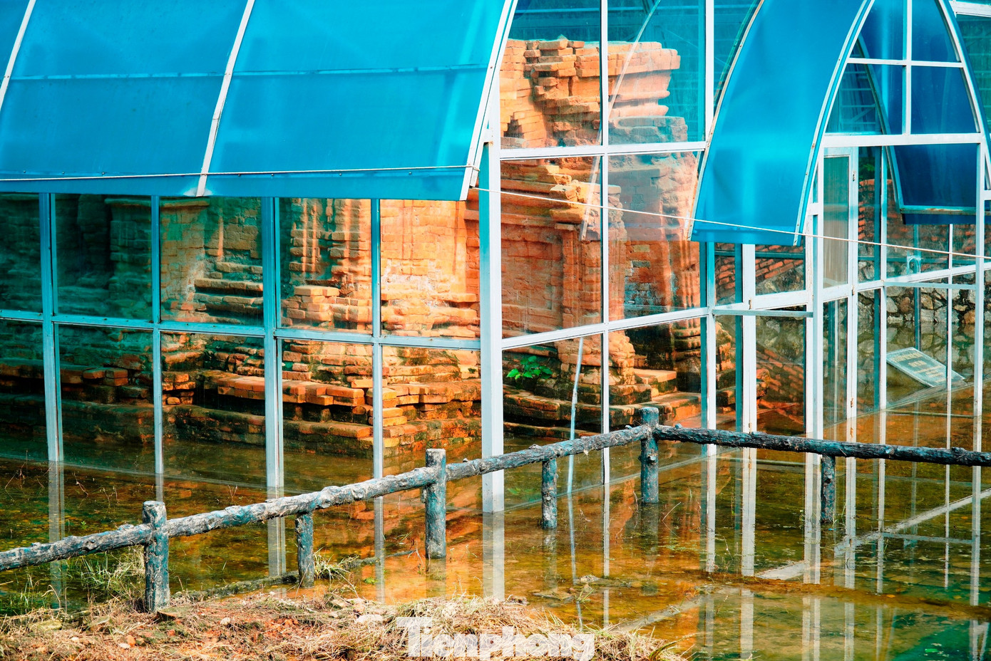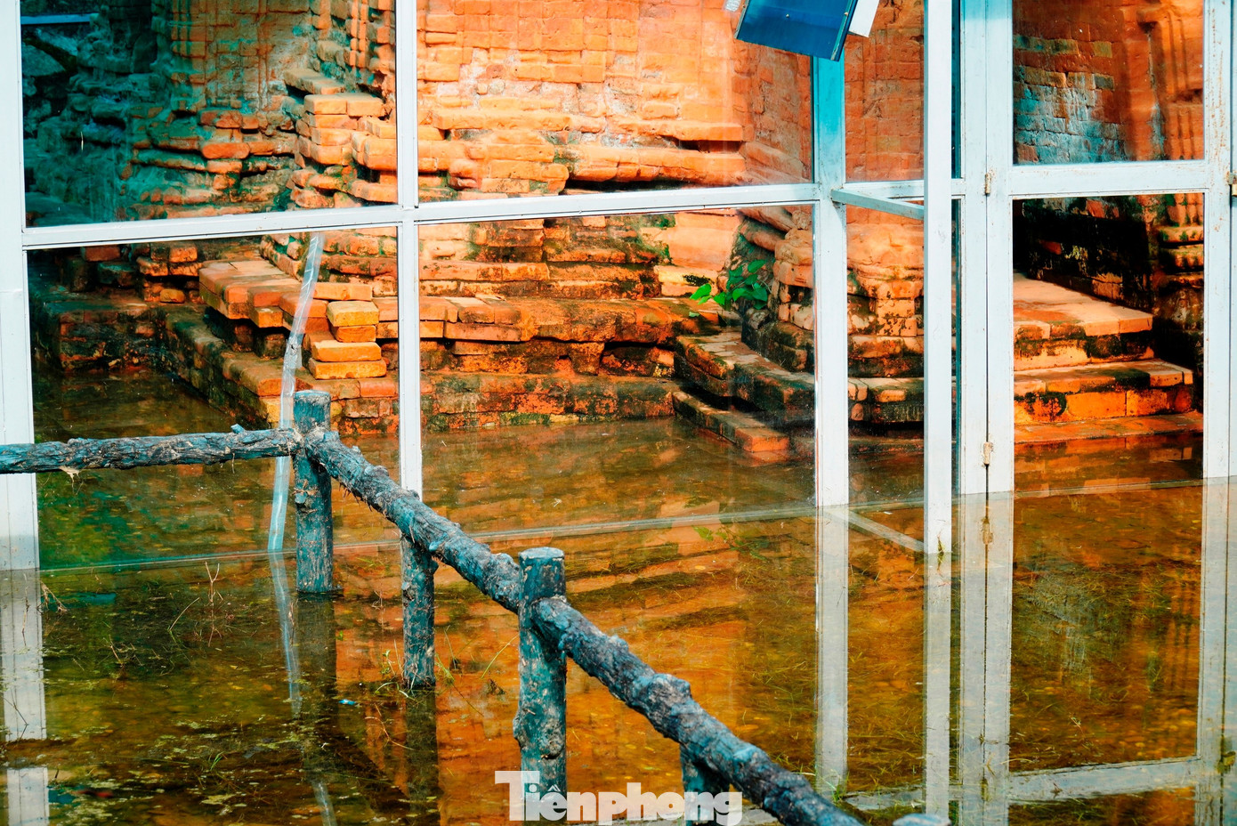 Theo ghi nhận của phóng viên, đến sáng 10/11, khu vực quanh chân móng tháp và trong khuôn viên di tích vẫn còn ngập nước ở mức cạn, trong khi máy bơm tạm dừng hoạt động.
