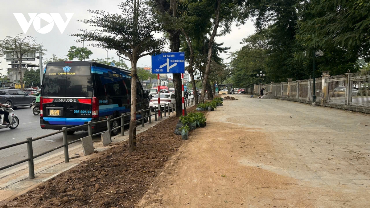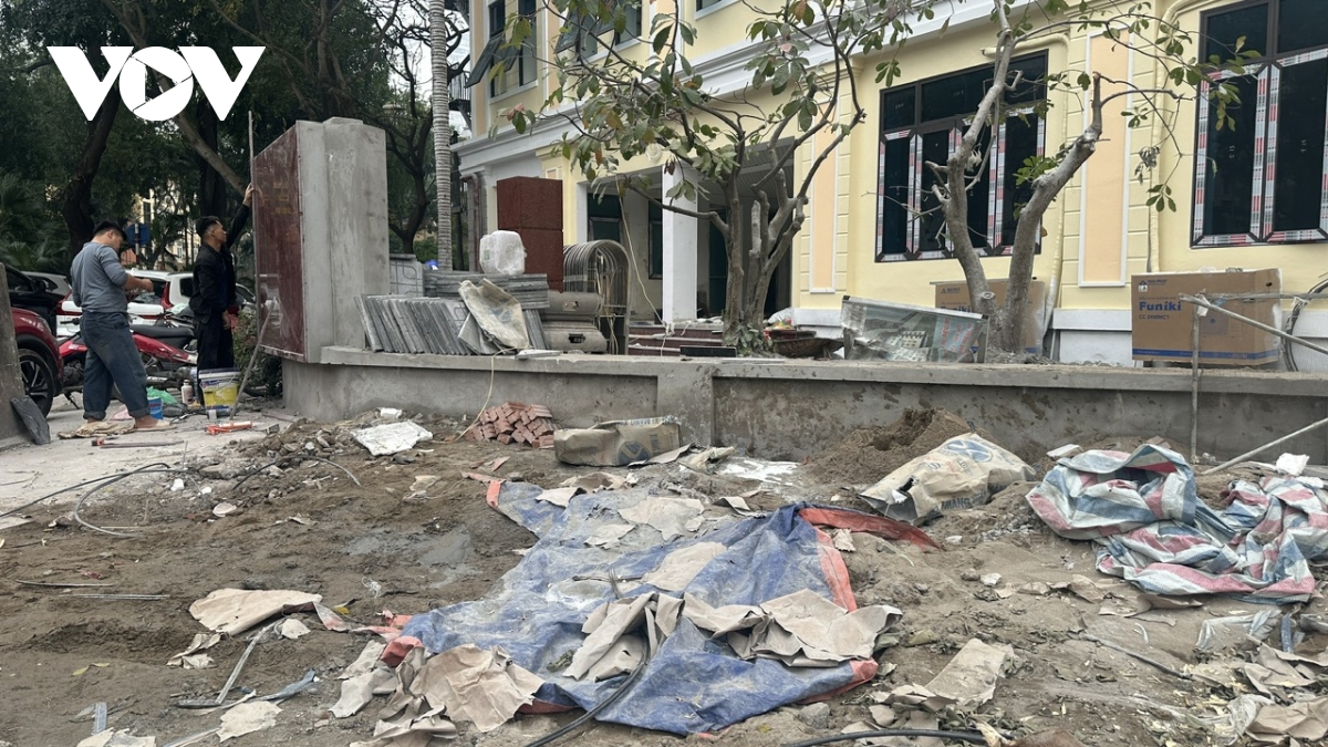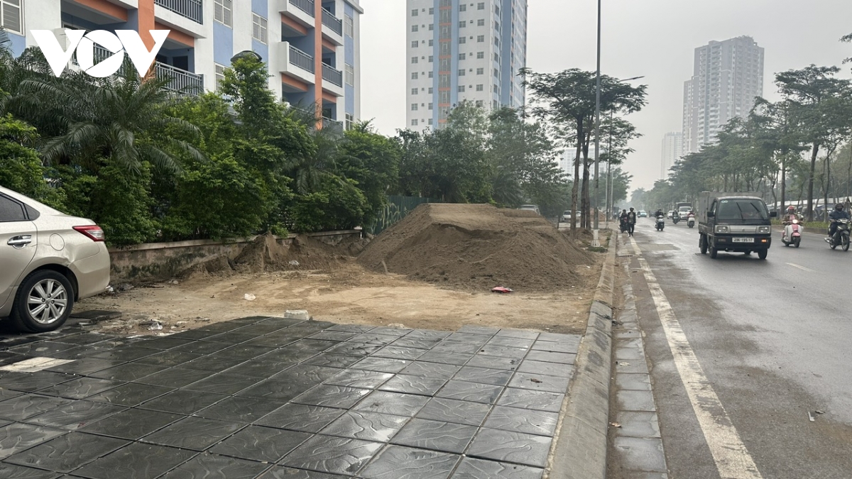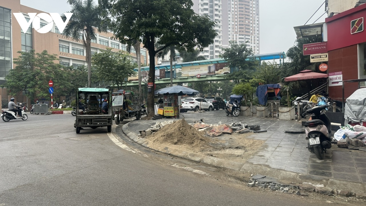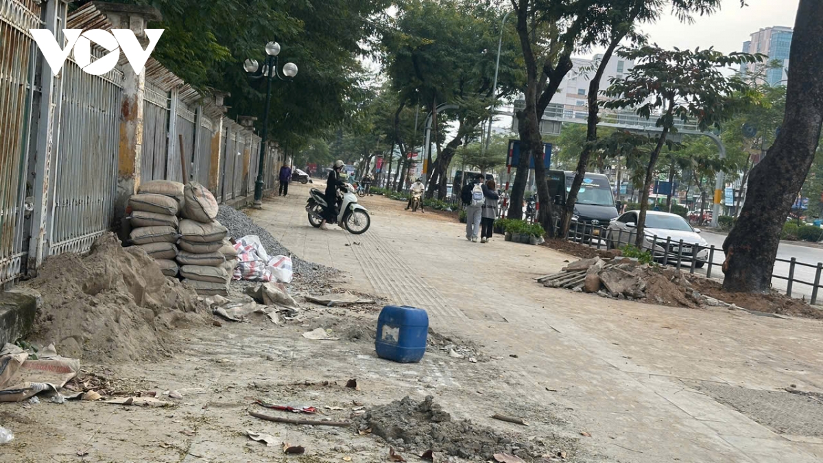 Vật liệu thi công cải tạo lát vỉa hè để ngổn ngang không che chắn, giảm bụi.