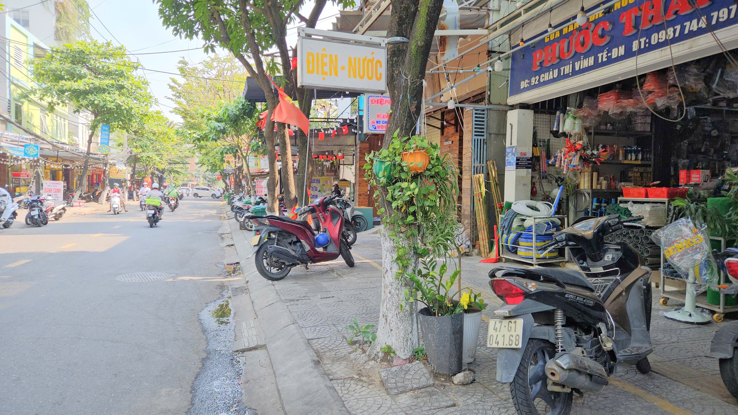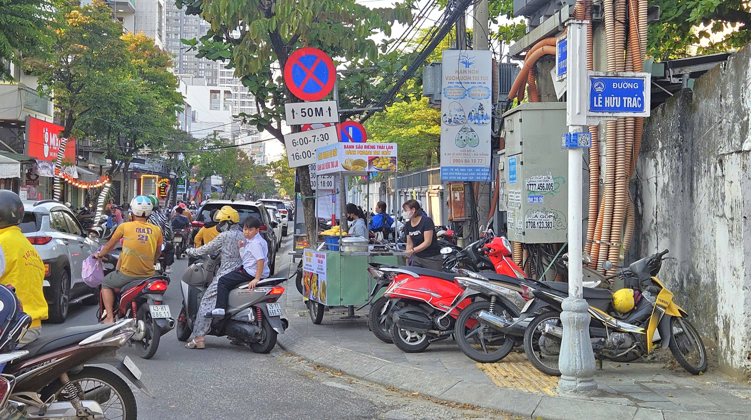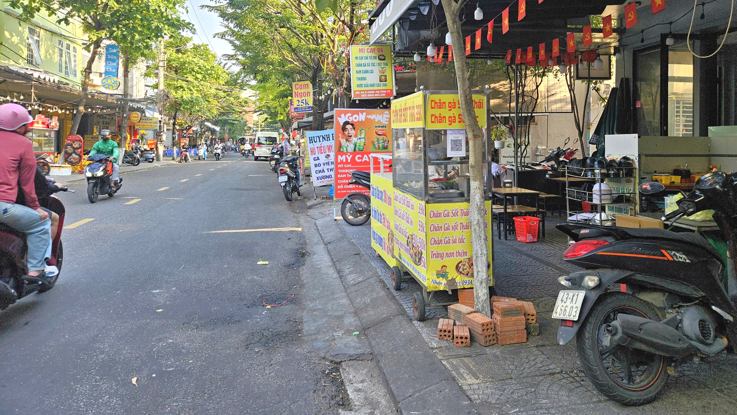 Vỉa hè ở góc đường Phạm Cự Lượng - Nguyễn Duy Hiệu, phường An Hải sau một tuần. Không còn cảnh buôn bán chiếm hết vỉa hè, nhưng vẫn còn một số hộ kinh doanh dựng bảng hiệu vắt vẻo xuống lòng đường. Ảnh: TẤN VIỆT
