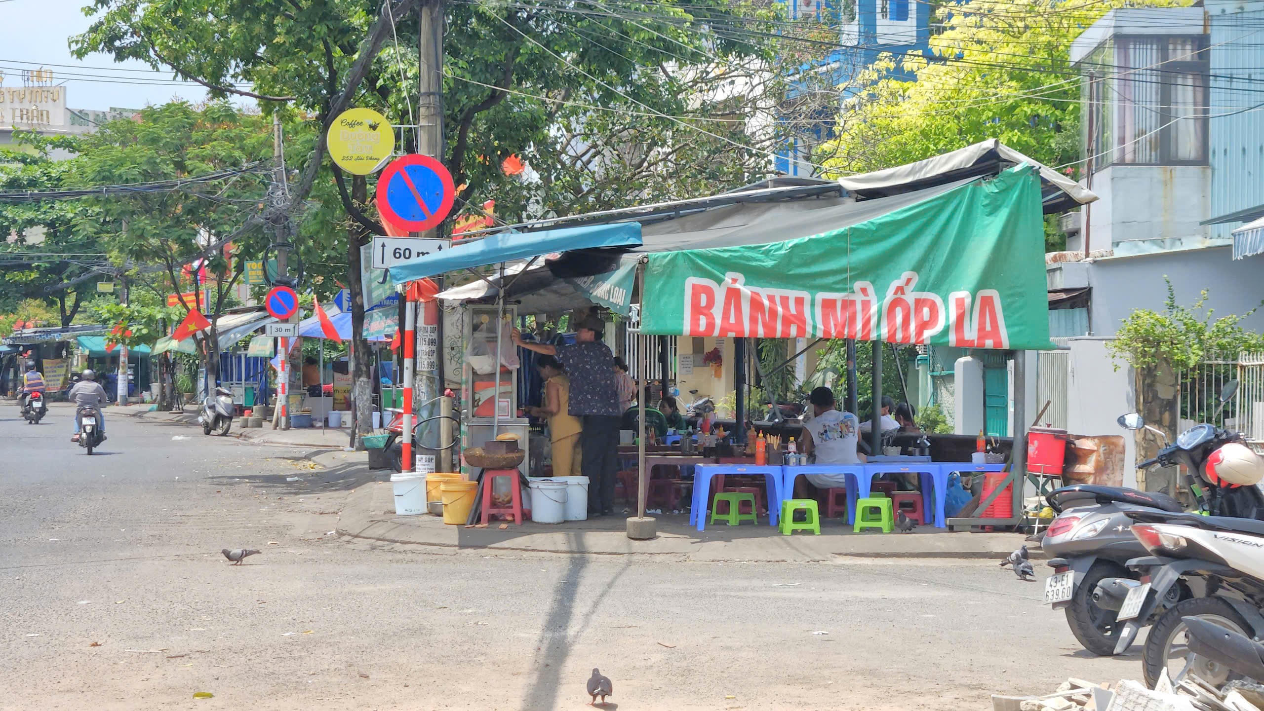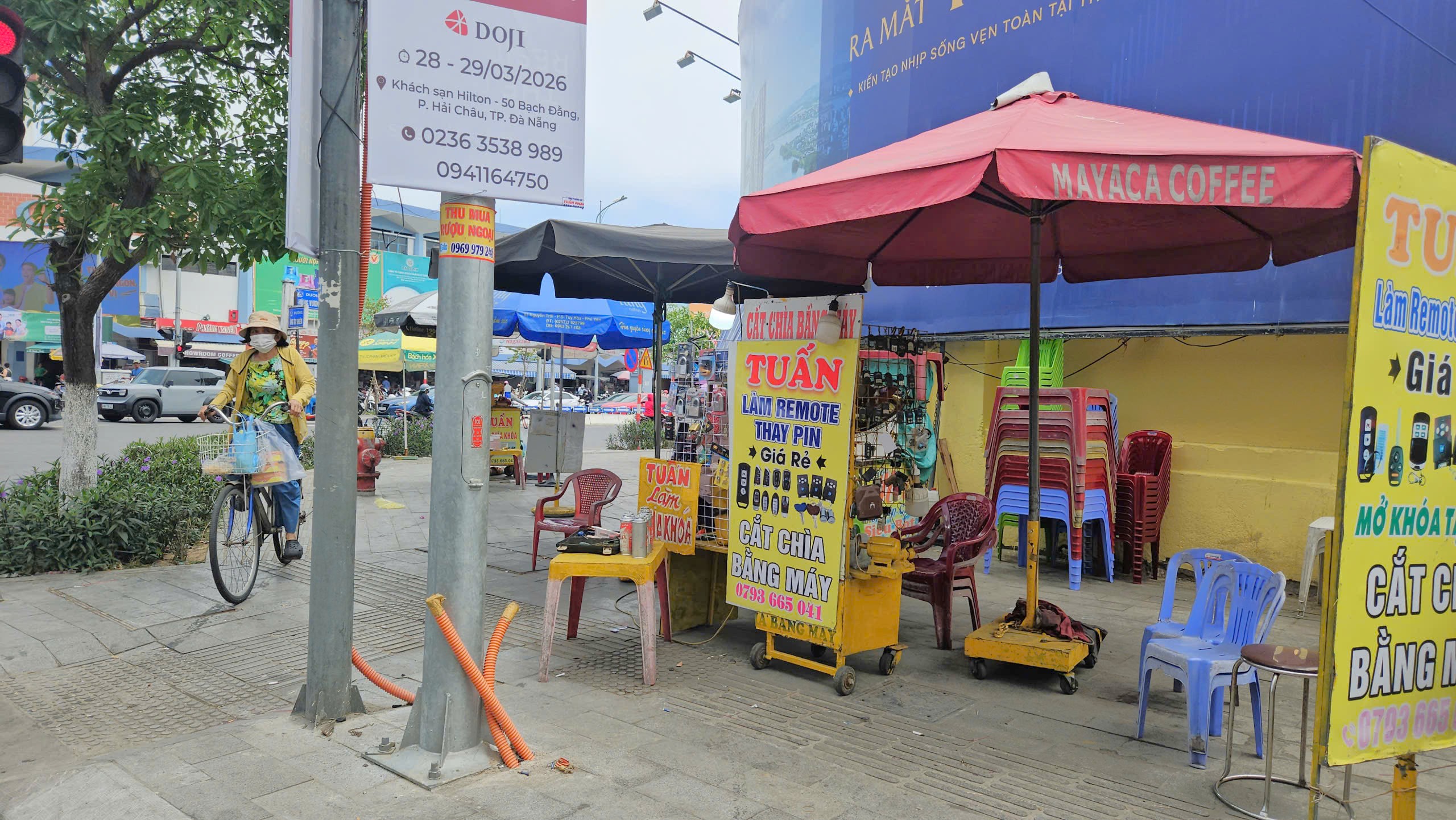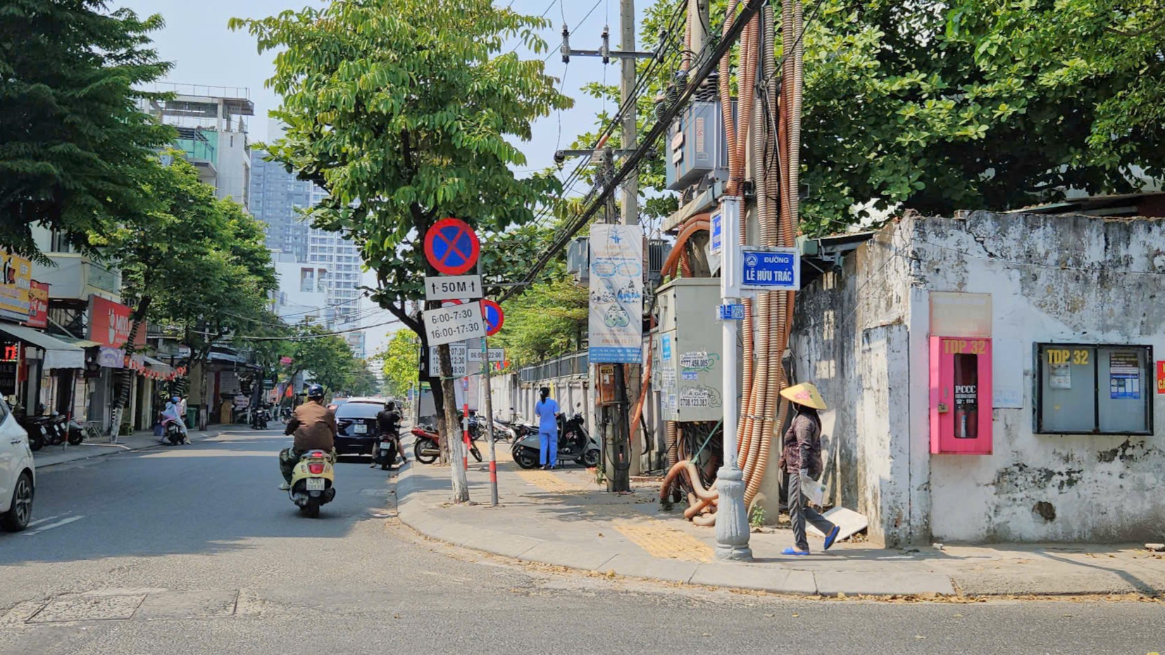 Vỉa hè ở góc đường Phạm Cự Lượng - Nguyễn Duy Hiệu, phường An Hải sau một tuần. Không còn cảnh buôn bán chiếm hết vỉa hè, nhưng vẫn còn một số hộ kinh doanh dựng bảng hiệu vắt vẻo xuống lòng đường. Ảnh: TẤN VIỆT