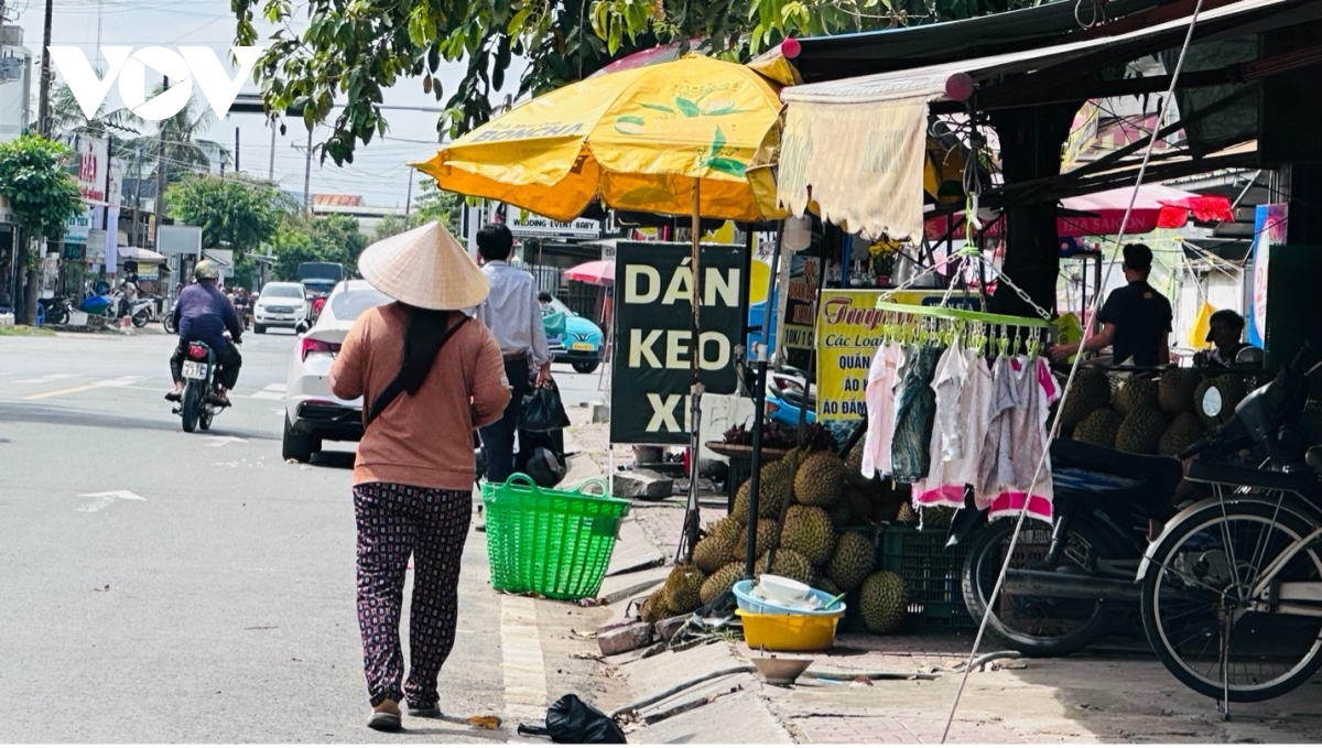 Ghi nhận tại tuyến đường Điện Biên Phủ dài khoảng 3km, hàng loạt sạp trái cây bày bán sầu riêng, dưa hấu, cùng biển hiệu quảng cáo, cửa hàng kim khí, điện máy ngang nhiên chiếm trọn vỉa hè. Lối đi dành cho người đi bộ gần như bị “xóa sổ”, buộc người dân phải đi xuống lòng đường giữa dòng xe cộ đông đúc.
