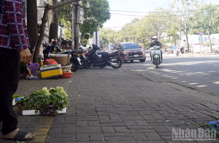 Một người dân bán rau để hàng của mình tránh ra lối đi bộ.