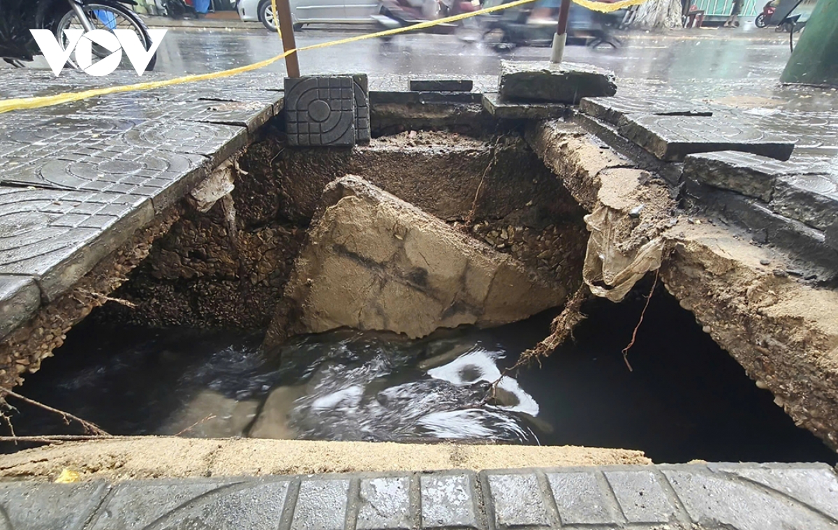 Ghi nhận tại hiện trường, hố sụp rộng khoảng 1,2 mét, dài khoảng 1 mét. Bên dưới là cống thoát nước, trong đó tấm bê tông đậy cống đã bị gãy đôi, khiến phần vỉa hè phía trên mất kết cấu và sụp xuống.