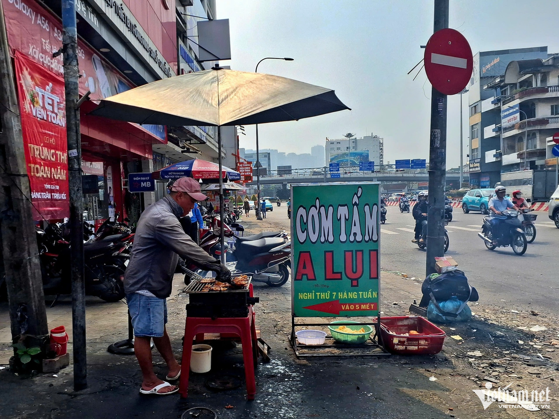 Gây ô nhiễm không khí là một chuyện. Các quán ăn, hàng rong còn tận dụng không gian chung vỉa hè và biến phần diện tích này thành địa điểm kinh doanh riêng. Đơn cử, đoạn đường Điện Biên Phủ kéo dài từ khu vực Trường Đại học Công nghệ TPHCM tới Đại học Hồng Bàng, Đại học Kinh tế - Tài chính luôn trong tình trạng nhếch nhác với rác thải vứt bừa bãi, vỉa hè cho người đi bộ hoàn toàn bị hàng ăn độc chiếm.