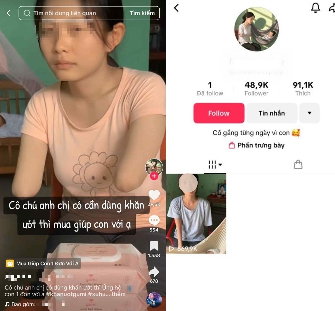 Gần đây, mạng xã hội lan truyền tài khoản TikTok đăng hàng loạt video về một người phụ nữ bị cụt hai tay, phải bán hàng để nuôi con nhỏ. Trong các clip, người này mặc quần áo đơn giản, nói những lời thương cảm để giới thiệu sản phẩm như khăn giấy, nước tẩy rửa.