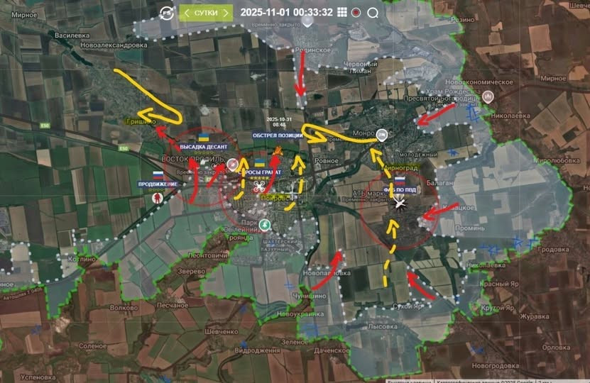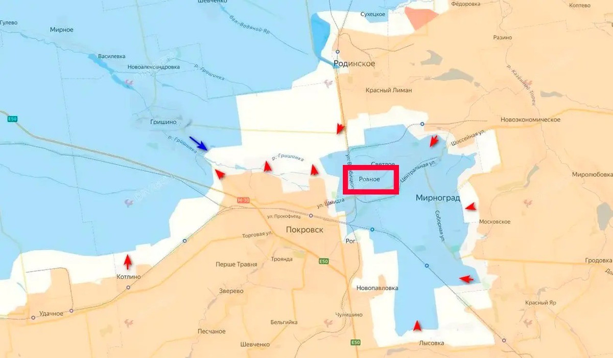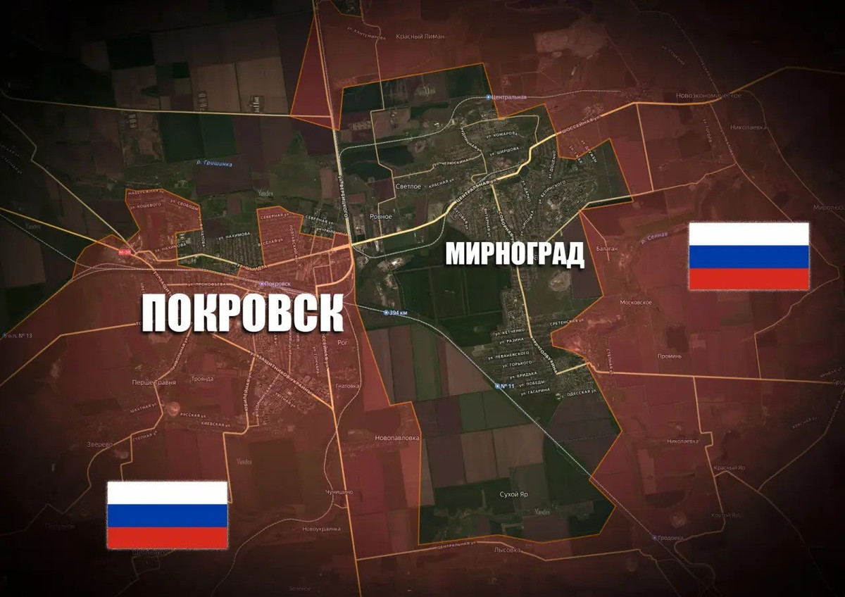 Trong 24 giờ qua, lực lượng Nga cũng đã kiểm soát thêm 35 tòa nhà ở Pokrovsk. Vùng ngoại ô phía bắc của thành phố, quân Nga vẫn chưa chiếm được. Xa hơn về phía đông là khu đô thị Myrnohrad và các làng vệ tinh của nó, bao gồm Rivne và Svetloe đã đề cập ở trên.