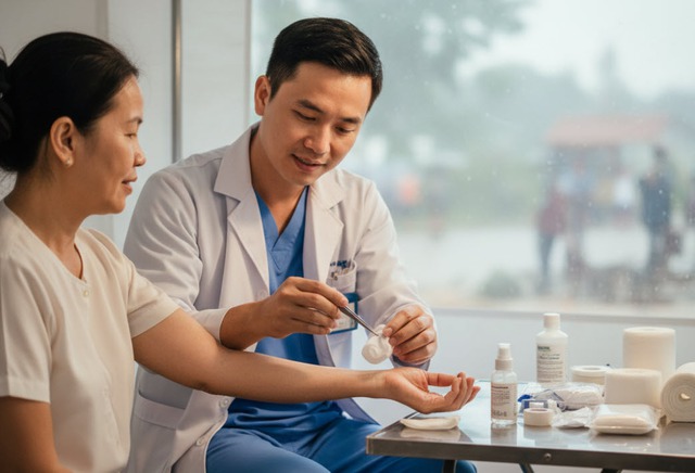 Bác sĩ hướng dẫn chăm sóc vết thương da và cách phòng viêm mô tế bào sau mưa bão. Hình minh họa.