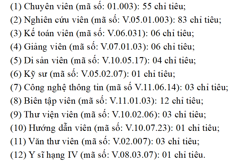 Số lượng người mà Viện Hàn lâm Khoa học xã hội Việt Nam cần tuyển dụng ở từng vị trí việc làm (gồm 178 chỉ tiêu) như sau: