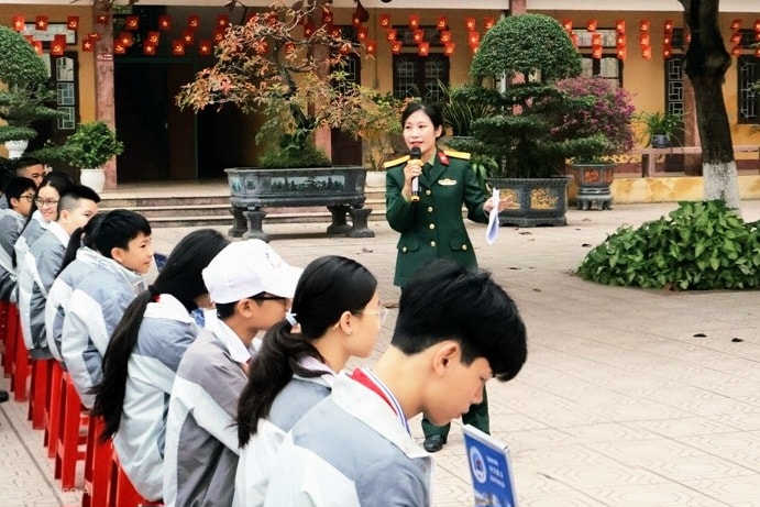 Thiếu tá Nguyễn Thị Huân, Phó Viện trưởng VKSQS Khu vực 32 tiến hành tuyên truyền, trao đổi cùng học sinh. Ảnh: Thế Tùng