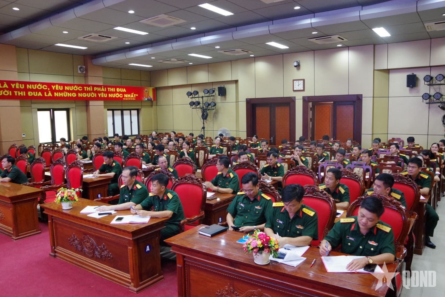 Cán bộ, nhân viên Bộ CHQS tỉnh Quảng Trị tham gia quán triệt, học tập.