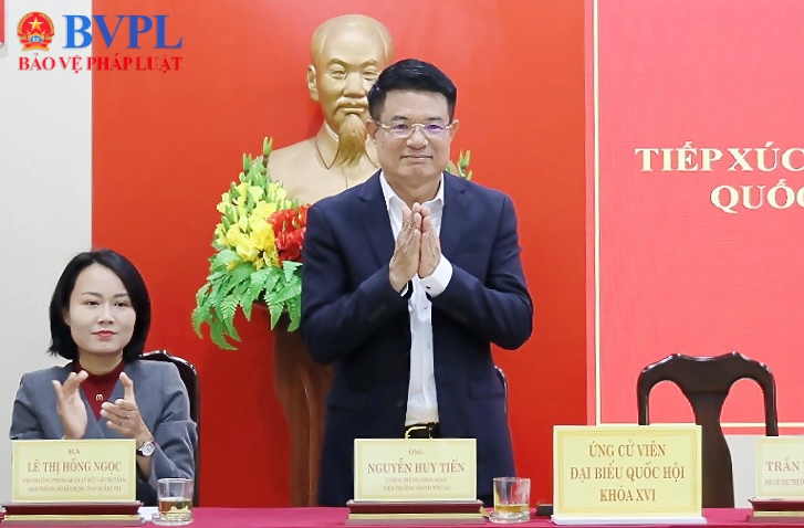 Đồng chí Nguyễn Huy Tiến, Viện trưởng VKSND tối cao và các ứng cử viên trò chuyện với các cử tri tại Hội nghị.