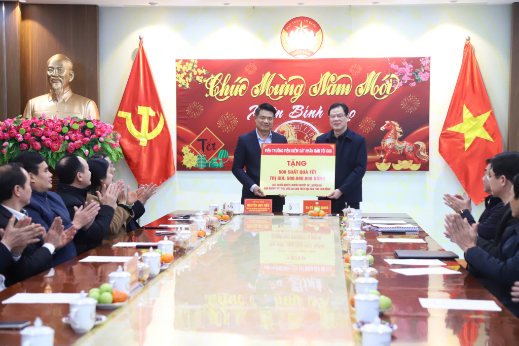 Tại buổi làm việc, thay mặt lãnh đạo Đảng, Nhà nước, đồng chí Nguyễn Huy Tiến, Viện trưởng Viện Kiểm sát nhân dân Tối cao trao 500 suất quà tết, tổng trị giá 500 triệu đồng cho Ủy ban MTTQ tỉnh.