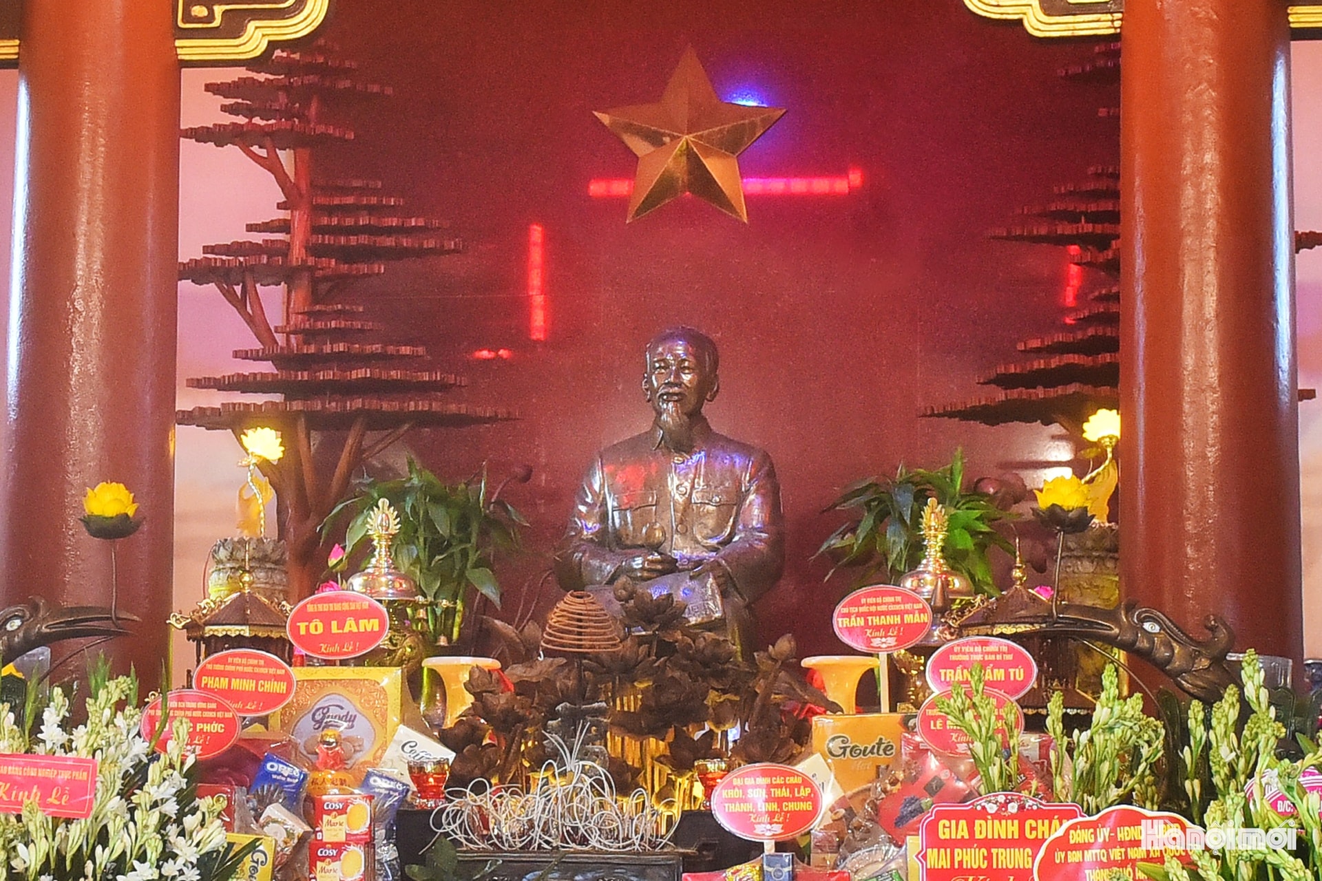 Tấm bản đồ Việt Nam lớn phía sau Đền thờ - biểu tượng của một đất nước thống nhất, nơi lý tưởng của Người luôn hiện hữu.