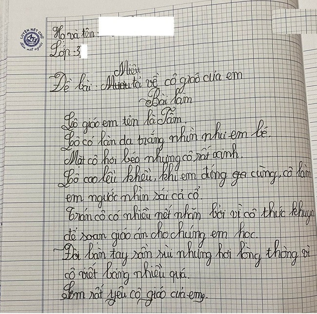 Theo đó, sau đó khi nhận được đề tài, cô bé lớp 3 đã trình bày bài văn tả cô giáo tên Tâm của mình như sau: "Cô giáo em tên là Tâm. Cô có làn da trắng mịn như da em bé. Mặt cô hơi béo nhưng rất xinh. Cô cao lều khều, khi em đứng cùng cô làm em ngước nhìn sái cả cổ. Trán cô có nhiều nếp nhăn bởi vì cô thức khuya để soạn giáo án cho chúng em học. Đôi bàn tay sần sùi nhưng hơi lòng thòng vì cô viết bảng nhiều quá. Em rất yêu cô giáo em".