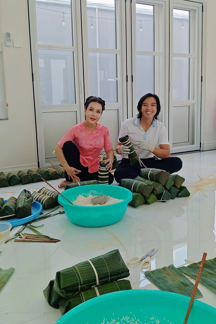 Hình ảnh Việt Hương và ông xã - nhạc sĩ Hoài Phương gói bánh, chuẩn bị cho Tết Nguyên đán.