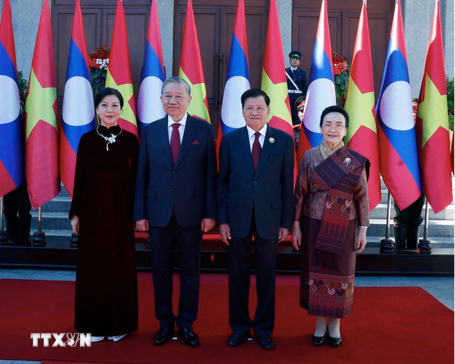 Tổng Bí thư Tô Lâm và Tổng Bí thư, Chủ tịch nước Lào và hai Phu nhân tại lễ đón ngày 1/12. Ảnh: TTXVN