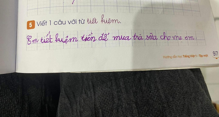 Bên dưới phần bài làm, em học sinh trình bày như sau: "Em tiết kiệm tiền để mua trà sữa cho mẹ em".