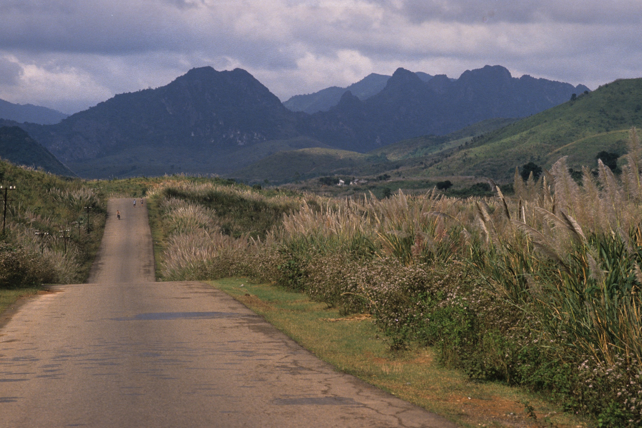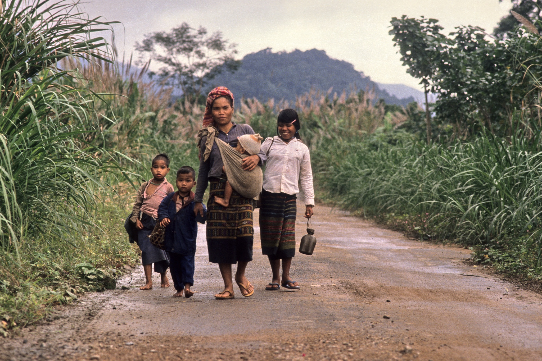 Một gia đình trên đường trở về Quảng Trị, phía xa là những dãy núi hoang sơ, hùng vĩ trải dài trong tầm mắt.