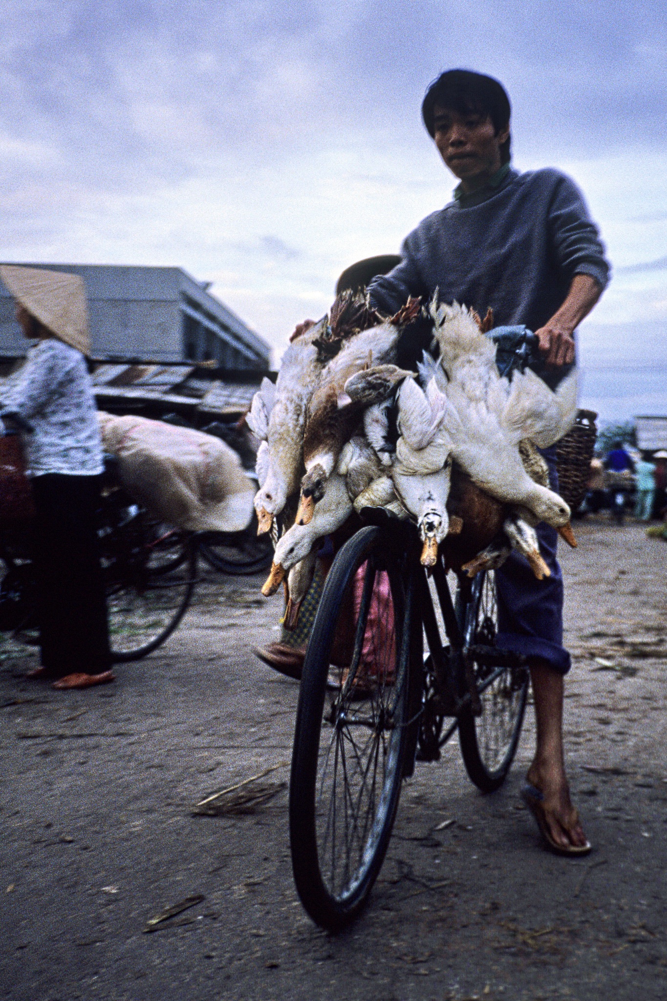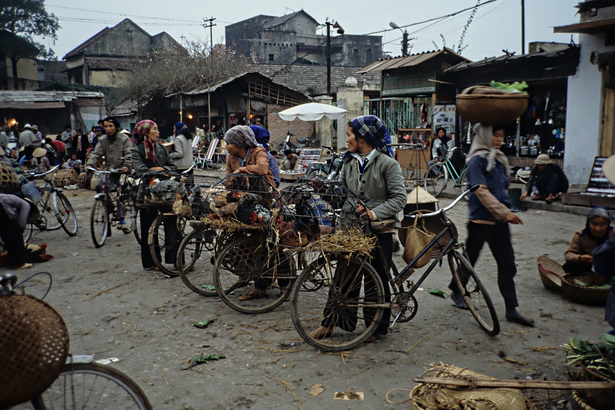 Người dân Hà Nội chở theo những chiếc lồng sắt bán gà. Khác với người miền Trung quen đội nón lá, người Hà Nội khi ấy thường quấn khăn vải gọn gàng, vừa giữ ấm đôi tai, vừa thuận tiện cho những buổi xuống phố mưu sinh.
