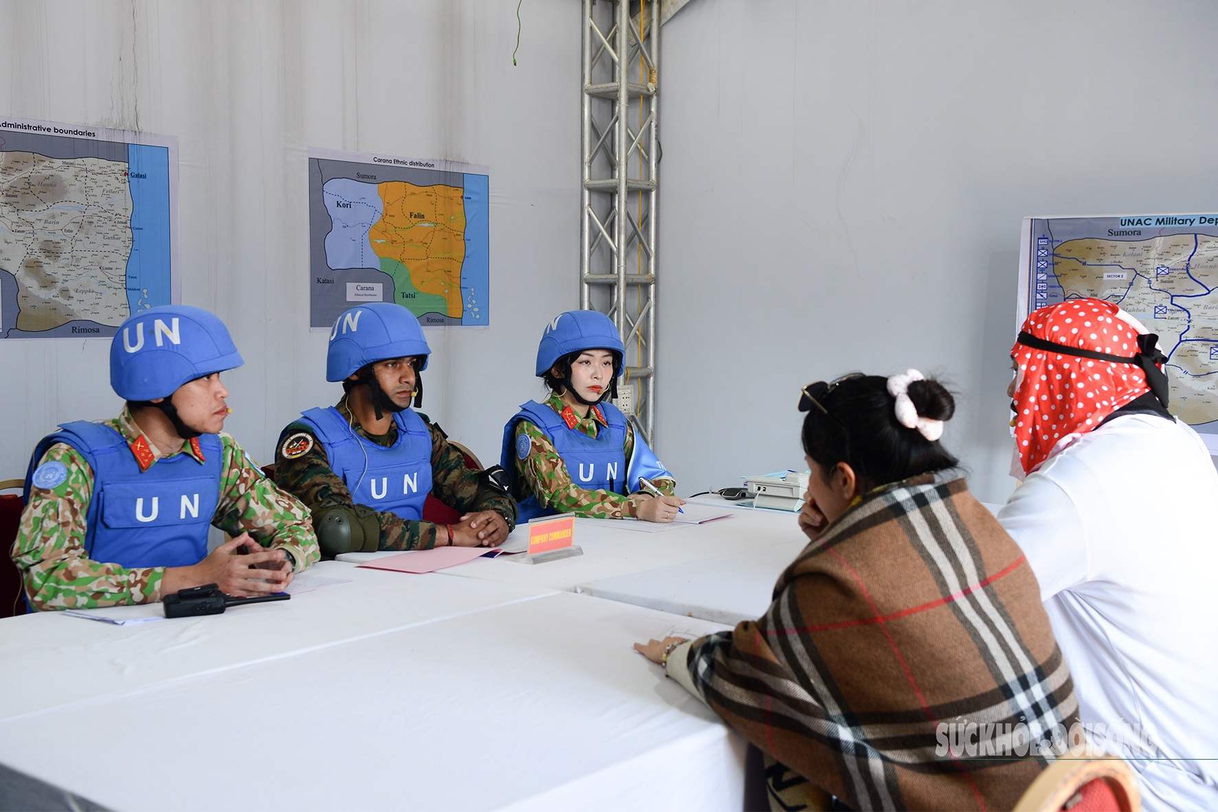 Chỉ huy Đội Công binh cùng 2 Quan sát viên quân sự gặp người đứng đầu chính quyền địa phương và người phụ nữ cáo buộc bị quấy rối để đàm phán.