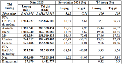 Australia tiếp tục duy trì vị thế là thị trường cung cấp lúa mì lớn nhất cho Việt Nam. Trong năm 2025, nhập khẩu từ Australia đạt 1,39 triệu tấn, tương đương 380,37 triệu USD. Thị trường này chiếm 25,4% tổng lượng và 26,1% tổng kim ngạch nhập khẩu của cả nước. Dù giá trung bình giảm 9,3% (xuống còn 274,1 USD/tấn), nhưng lượng nhập khẩu từ Australia vẫn tăng 15,8% so với năm 2024.
