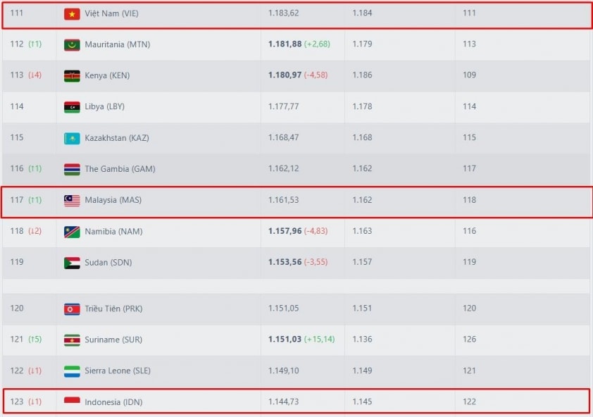 Trong khi đó, Thái Lan đã tăng 2 bậc lên vị trí 95 thế giới sau chiến thắng 3-2 trước Singapore. Ngược lại, Indonesia, đội không thi đấu giao hữu trong tháng 11, đã bị tụt 1 bậc xuống vị trí thứ 123 thế giới. Đội tuyển Việt Nam hiện vẫn giữ nguyên thứ hạng 111.