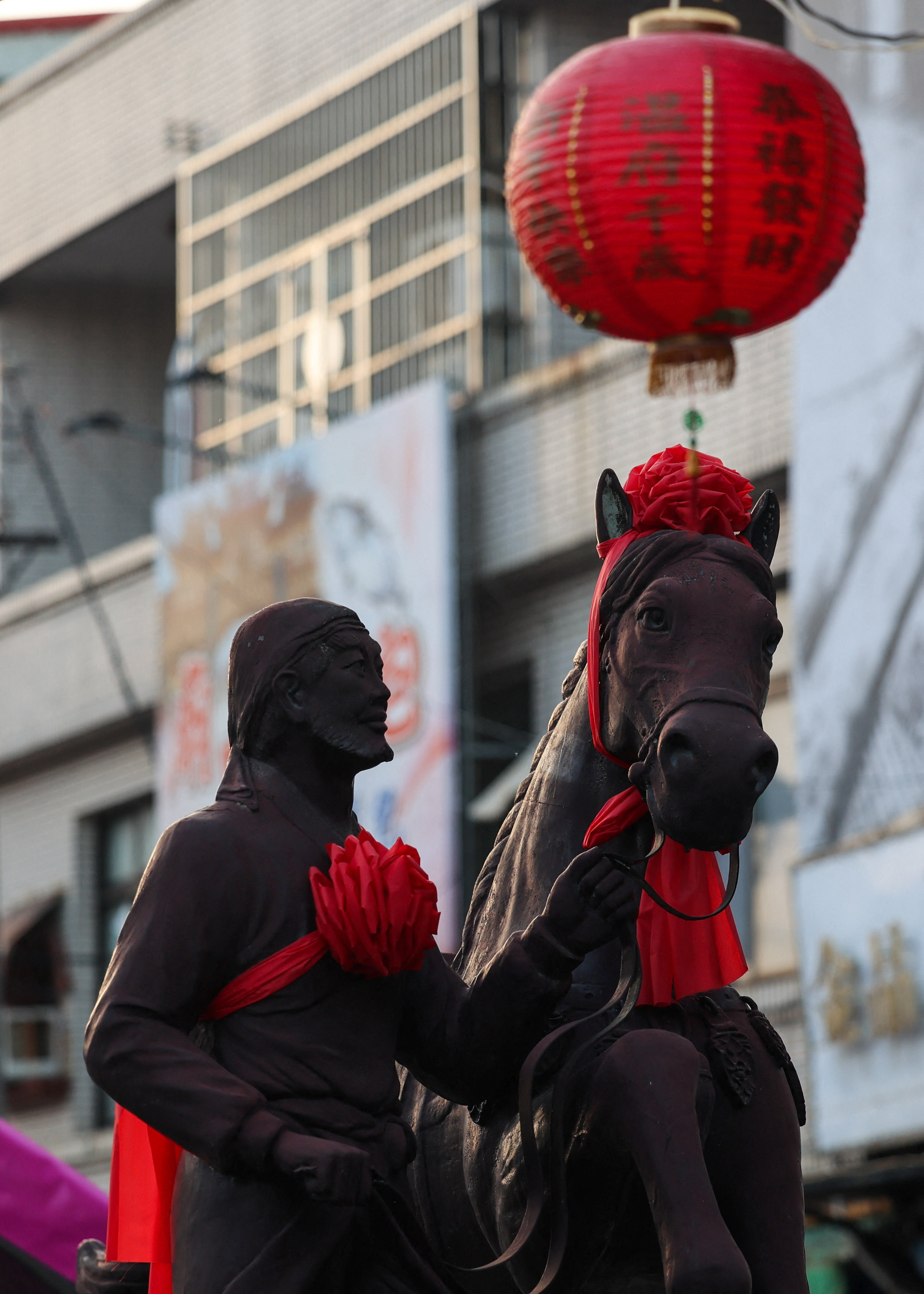 Tượng ngựa được trang trí lộng lẫy tại chùa Đông Long vào đêm giao thừa Tết Nguyên đán Bính Ngọ tại Đông Cương, huyện Bình Đông, Đài Loan, Trung Quốc.