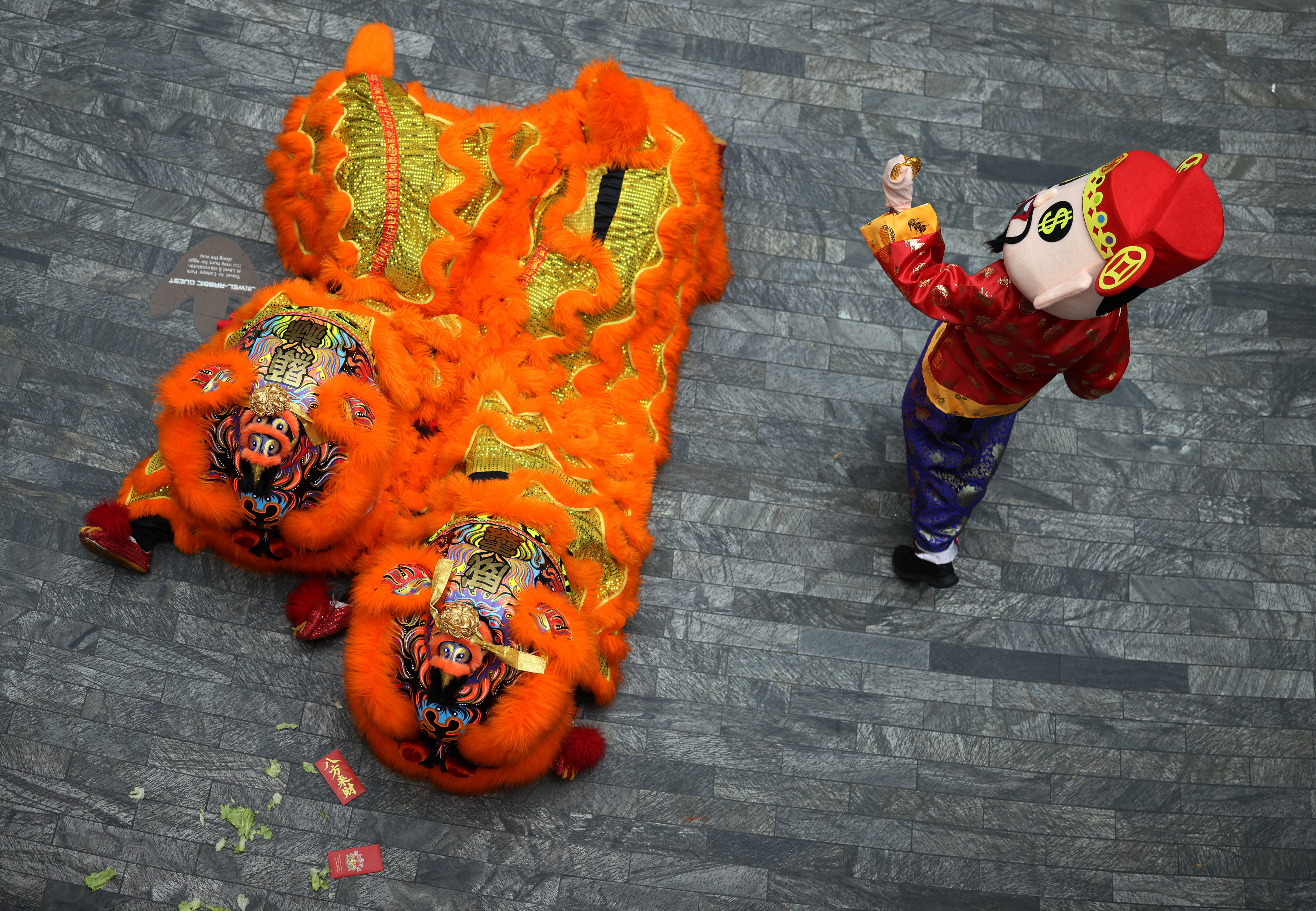Một nghệ sỹ hóa trang thành thần Tài chuẩn bị ném "tiền vàng" cho khán giả trong màn múa lân vào một ngày trước Tết Nguyên đán tại sân bay Jewel Changi, Singapore.