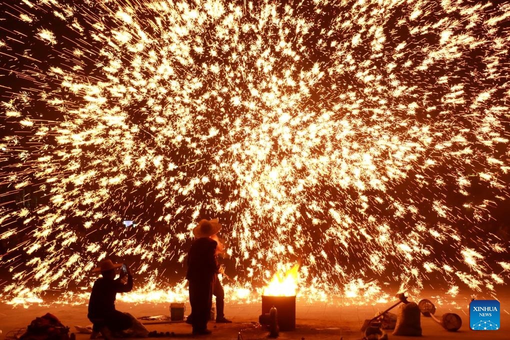 Các nghệ sỹ biểu diễn màn trình diễn pháo hoa sắt nóng chảy tại An Dương, tỉnh Hà Nam.